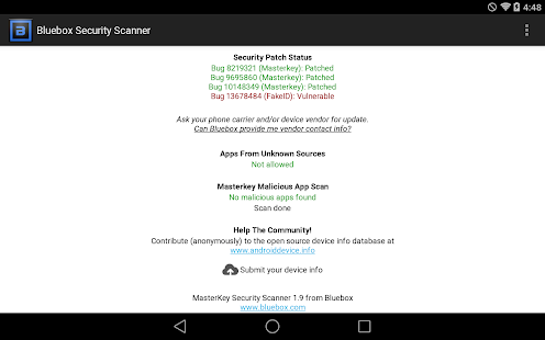 - If your system is vulnerable or patched to any of the "Fake ID" or "Master Key" security flaws affecting most Android devices